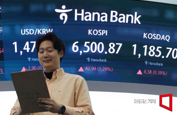 미국과 이란의 종전 협상 재개 낙관론에 뉴욕증시 3대 지수가 강세로 마감한 가운데 코스피도 장중 6550선을 돌파하며 사상최고치로 경신한 23일 서울 중구 하나은행 본점 딜링룸에서 직원이 증시와 환율 등을 모니터하고 있다. 2026.4.23 조용준 기자