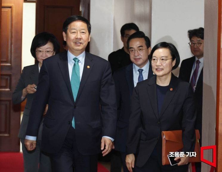 구윤철 경제부총리 겸 재정경제부 장관을 비롯한 박홍근 기획예산처 장관, 한성숙 중소벤처기업부 장관 등이 24일 서울 종로구 정부서울청사에서 열린 비상경제본부회의 겸 국가창업시대 전략회의에 참석하고 있다.