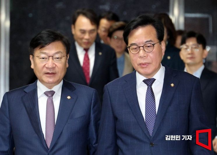 송언석 국민의힘 원내대표와 정점식 정책위의장이 24일 국회에서 열린 원내대책회의에 참석하고 있다.