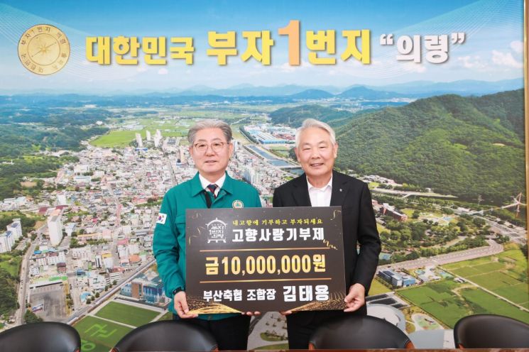 경남 의령군은 부산축협 김태용 조합장이 군을 방문해 고향사랑기부금 1000만 원을 기탁했다고 24일 밝혔다.