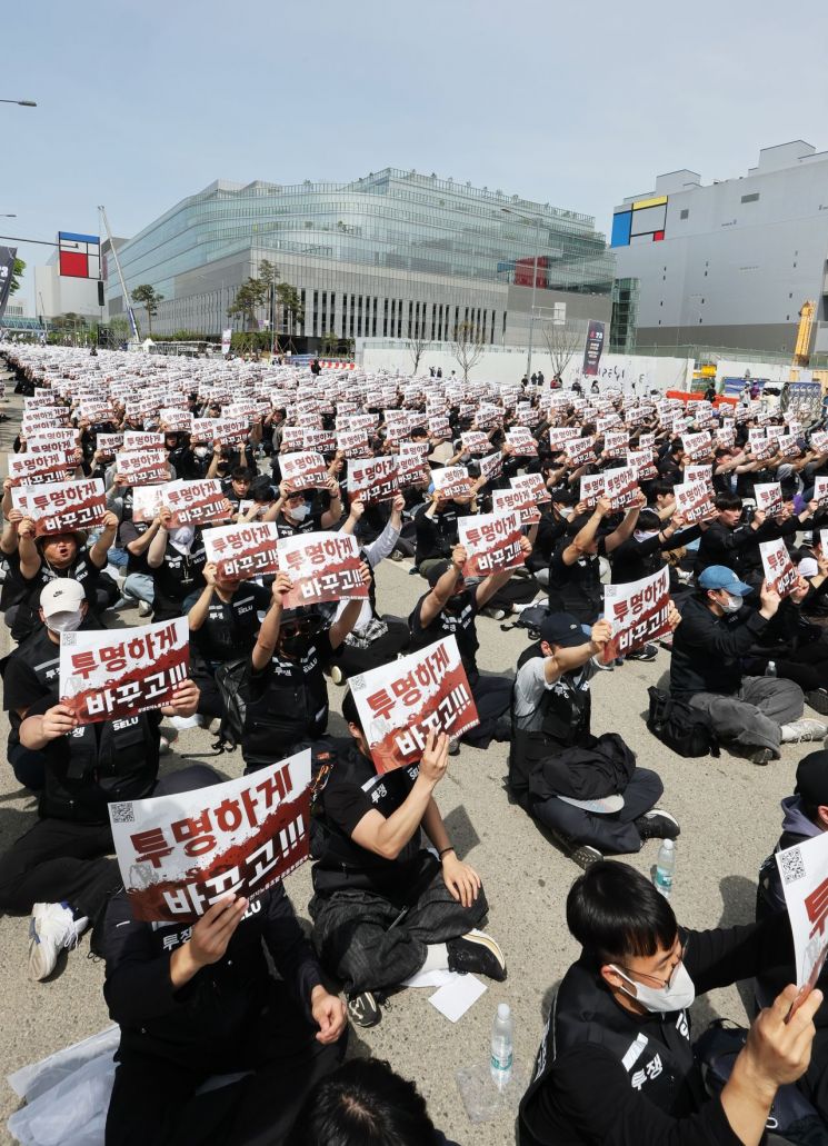 23일 경기도 평택시 삼성전자 평택캠퍼스 앞에서 열린 삼성전자 노동조합 공동투쟁본부의 '투명하게 바꾸고, 상한폐지 실현하자-4/23 투쟁 결의대회'에서 조합원들이 구호를 외치고 있다. 연합뉴스.