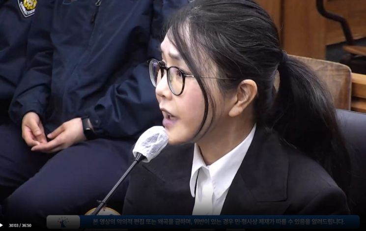 김건희 여사가 지난 13일 서울 서초구 서울중앙지법 형사합의33부(이진관 부장판사) 심리로 열린 박성재 전 법무부 장관의 내란 중요임무 종사 혐의 사건의 속행 공판에 증인으로 출석해 증언하고 있다. 서울중앙지법 연합뉴스