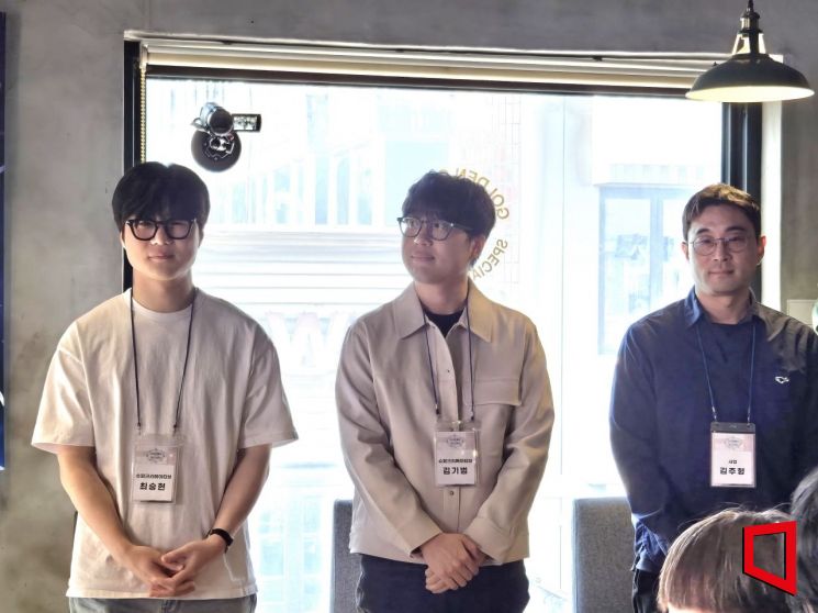최승현 라이브 디렉터(왼쪽부터), 김기범 전투 담당, 김주형 사업실장이 25일 서울 마포구 홍대입구역 골든크레마 카페에서 '카오스 제로 나이트메어' 출시 6개월 기념 기자 간담회에서 인사하고 있다. 노경조 기자