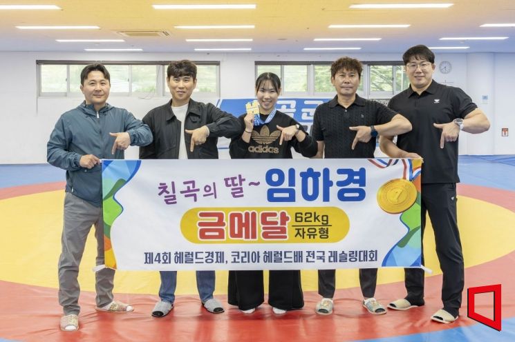 전국 레슬링대회 금메달 수상을 기념해 왼쪽부터 박근용 칠곡군레슬링협회 경기이사, 아버지 임종구 씨, 임하경, 박노운 칠곡군레슬링협회 이사, 김재강 칠곡군청 레슬링 감독이 기념 촬영을 하고 있다.[사진=칠곡군청 제공]