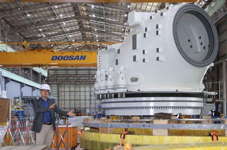 지난 15일 경남 창원에 있는 두산에너빌리티 창원 공장에 들어가니 안전 작업대 위에 올려진 거대한 풍력터빈 메인프레임 여러 대가 한눈에 들어왔다. 이 메인프레임에 발전기와 각종 전자 장치를 부착하고 허브를 결합하면 풍력발전기 시스템이 완성된다.