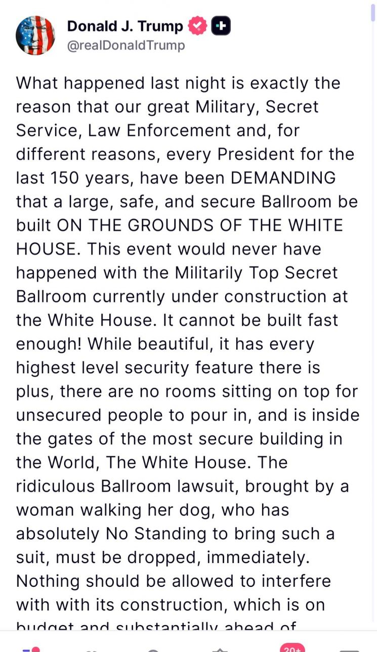 트럼프 대통령은 26일(현지시간) 사회관계망서비스(SNS) 트루스소셜에 "어젯밤 일어난 일은 우리의 위대한 군대, 비밀경호국, 법 집행 기관, 그리고 각기 다른 이유로 모든 대통령이 지난 150년간 백악관 부지에 크고 안전하고 보안이 철저한 연회장을 요구해온 바로 그 이유"라며 이같이 말했다.
