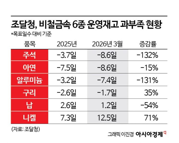 알루미늄 운영재고는 2022년(-10일), 2023년(-9일), 2024년(-8일), 2025년(-3.2일) 등 최근 5년간 개선됐다가 중동 전쟁으로 급격히 악화했다. 같은 기간 주석도 -3.7일에서 -8.6일로, 아연도 -7.5일에서 -8.6일로 각각 부족 폭이 커졌다. 구리는 다소 개선됐지만, 여전히 목표치를 채우지 못했다. 목표 대비 물량을 유지한 금속은 납(2.6일→1.2일)과 니켈(7.3일→12.5일) 2종에 불과했다.