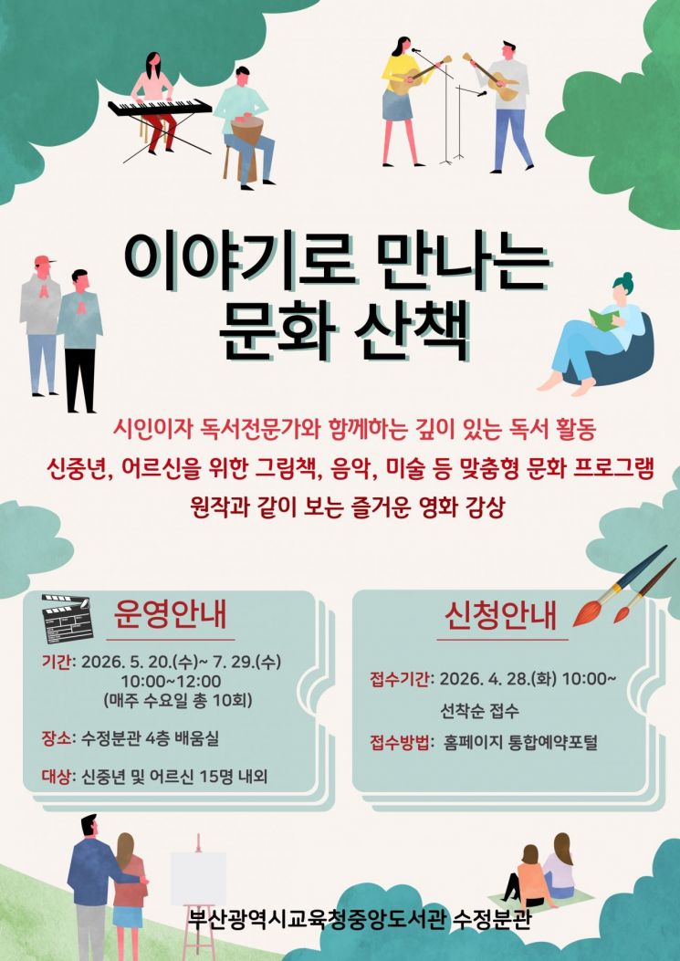 부산시립중앙도서관(관장 한동인)은 오는 5월 20일부터 7월 29일까지 매주 수요일, 중앙도서관 수정분관에서 신중년과 어르신 15명을 대상으로 '이야기로 만나는 문화 산책' 프로그램을 운영한다.