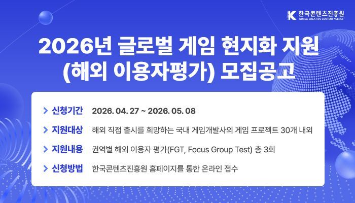 유현석 콘진원 원장직무대행은 "국내 게임개발사가 실제 이용자 반응을 반영해 세계 시장 진출 경쟁력을 강화하도록 현지화 지원을 지속하겠다"고 말했다.