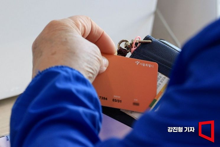 고유가 피해 지원금 1차 지급이 시작된 27일 서울 강서구 화곡4동 주민센터를 찾은 주민이 지원금 카드를 받고 있다.