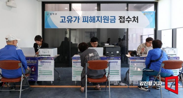 고유가 피해 지원금 1차 지급이 시작된 27일 서울 강서구 화곡4동 주민센터를 찾은 주민들이 지원금 신청을 하고 있다.