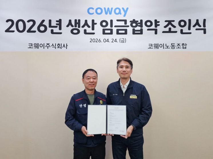코웨이는 생산 코웨이노동조합과 2026년도 임금협약이 최종 타결돼 조인식을 진행했다고 27일 밝혔다.