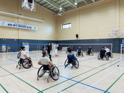 제2회 제주특별자치도 장애인체육대회 기간 중 휠체어 배드민턴 경기에 참가한 선수들이 승리를 향한 뜨거운 집념을 보이며 열띤 경기를 펼치고 있다. 제주특별자치도 제공