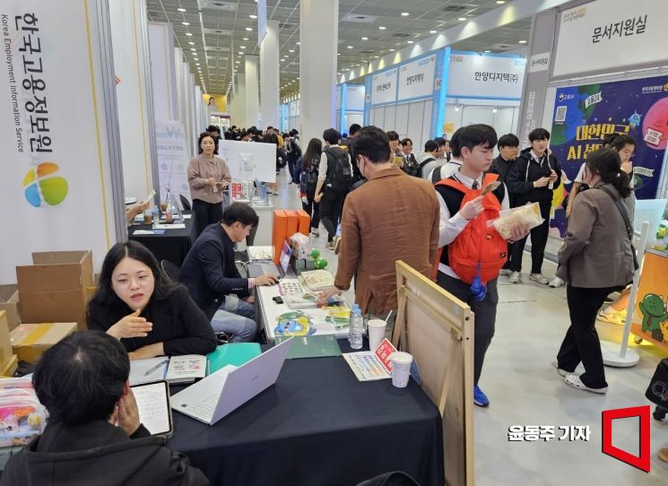 27일 서울 강남구 코엑스에서 열린 KB굿잡 취업박람회를 찾은 구직자들이 한국고용정보원 상담 부스에서 취업 전문 상담사애게 취업전문상담을 받고 있다. 한국고용정보원은 이번 박람회를 찾은 청년 구직자들을 대상으로 청년도전지원사업, 국민취업지원제도 등을 안내하고 1대1 심층 상담을 지원한다.
