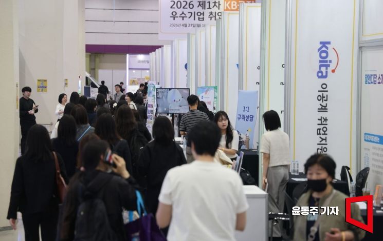 KB굿잡 취업박람회가 27일 서울 강남구 코엑스에서 열렸다. 박람회를 찾은 많은 구직자들이 면접을 보기 위해 줄을 서고 있다.