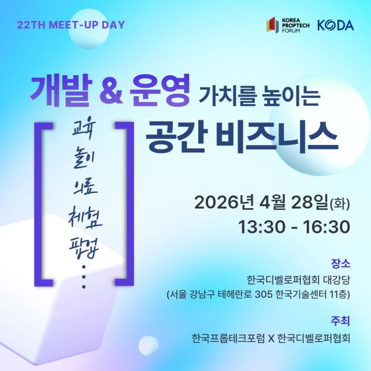 한국디벨로퍼협회는 28일 서울 강남구 역삼동 협회 대강당에서 '개발&운영 가치를 높이는 공간비즈니스'를 주제로 '제22회 밋업데이(Meet-Up Day) 행사를 개최한다.