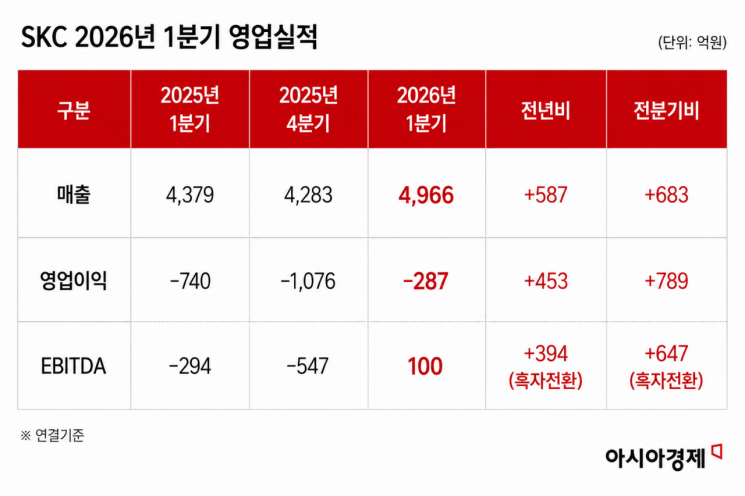 SKC는 27일 2026년 1분기 실적발표를 통해 연결기준 매출 4966억원, 영업손실 287억원을 기록했다고 밝혔다. 영업손실은 전 분기 대비 적자 폭을 줄였고, EBITDA는 100억원으로 2023년 2분기 이후 처음으로 분기 흑자를 달성했다.
