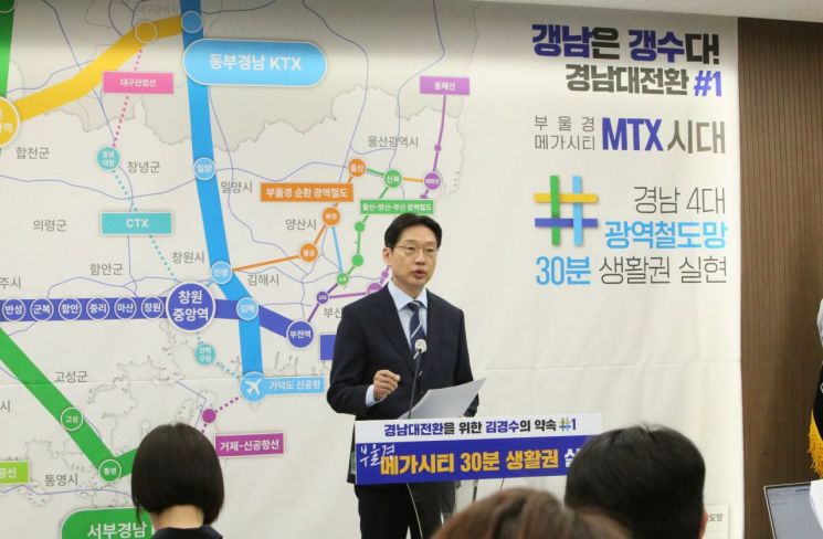 김경수 더불어민주당 경남도지사 예비후보가 4대 철도망 연결을 통한 '부울경 메가시티 30분 생활권 구축'을 제9회 전국동시지방선거 제1호 공약으로 내세웠다.