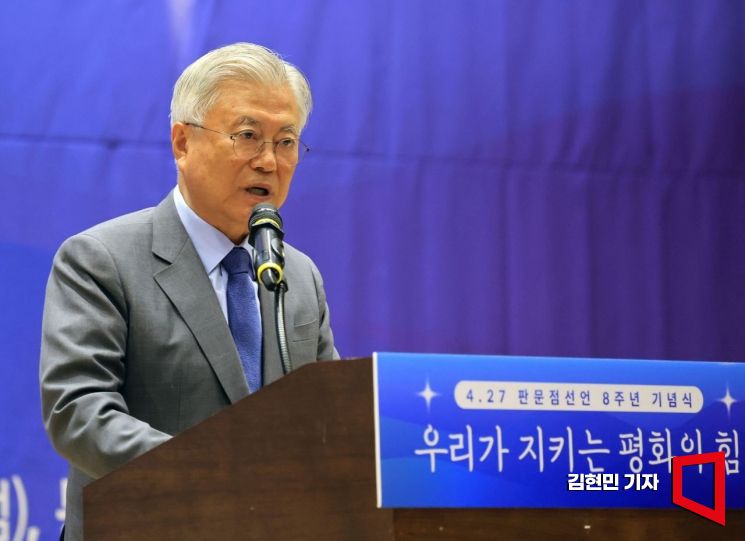 문재인 전 대통령이 27일 서울 여의도 국회에서 열린 판문점 선언 8주년 기념식에서 기념사를 하고 있다.