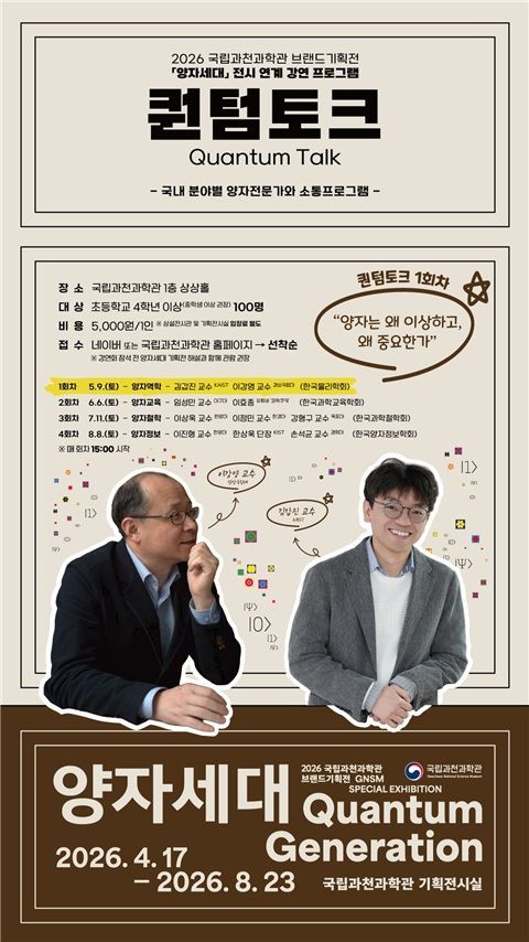 국립과천과학관은 2026년도 브랜드기획전 '양자세대(Quantum Generation)'와 연계한 강연 프로그램 '퀀텀토크'를 5월 9일부터 8월까지 매월 1회 운영한다고 28일 밝혔다. 강연과 질의응답 비율을 6대 4로 구성하고, 사전 오디오 가이드와 실시간 질문 시스템을 도입해 참여도를 높였다.