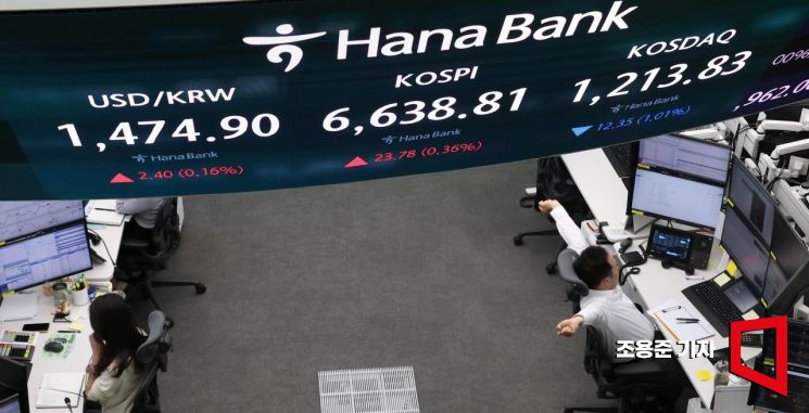 코스피가 전날 6600선을 넘어선 데 이어 또 한번 상승세를 이어가고 있는 28일 서울 중구 하나은행 본점 딜링룸에서 직원이 증시와 환율 등을 모니터하고 있다. 이날 코스피는 전 거래일 대배 0.48% 오른 6646.80으로 장을 시작했다.다.