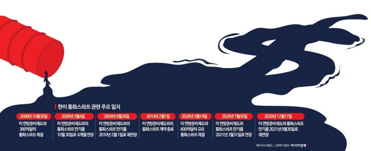 2008년 리먼 사태 직후 미국 중앙은행인 연방준비제도(Fed)는 달러 부족에 시달리는 외국은행들을 살리기 위해 조용히 외국 중앙은행에 수천억달러를 쏟아부었다. 그 수단으로 사용된 게 통화스와프다. 통화스와프는 두 나라의 돈을 맞교환할 수 있는 계약이다. 필요할 때 언제든 꺼낼 쓸 수 있어 '외화 마이너스 통장' '외화 유동성 안전판' 등으로 불린다. 리먼 사태 당시 미국과의 통화스와프 체결을 이끌었던 신제윤 기획재정부(현 재정경제부) 차관보는 '한미 통화스와프'의 의미를 주한미군 주둔 효과에 비유했다. 실제 통화스와프를 사용해야 하는 상황이 오지 않더라도 한미 간 스와프 체결 자체만으로 외환시장 위기에 대한 강력한 억제력과 신뢰 효과가 생긴다는 의미에서다.