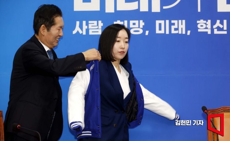 정청래 더불어민주당 최고위원이 2024년 1월 10일 국회에서 열린 민주당 7호 인재영입식에서 인재영입 7호 인사인 전은수 변호사에게 민주당 점퍼를 선물하고 있다. 사진=김현민 기자 kimhyun81@