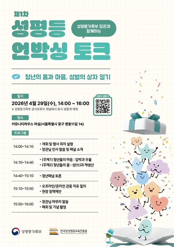 이번 행사는 청년들이 경험했거나 인식하고 있는 성별에 따른 편견과 몰랐던 사실을 대화를 통해 함께 풀어보고 이를 정책 의제로 연결하기 위해 마련됐다. 성평등 언박싱 토크는 올해 11월까지 총 4회에 걸쳐 각기 다른 주제로 청년들과의 소통을 이어갈 예정이다.