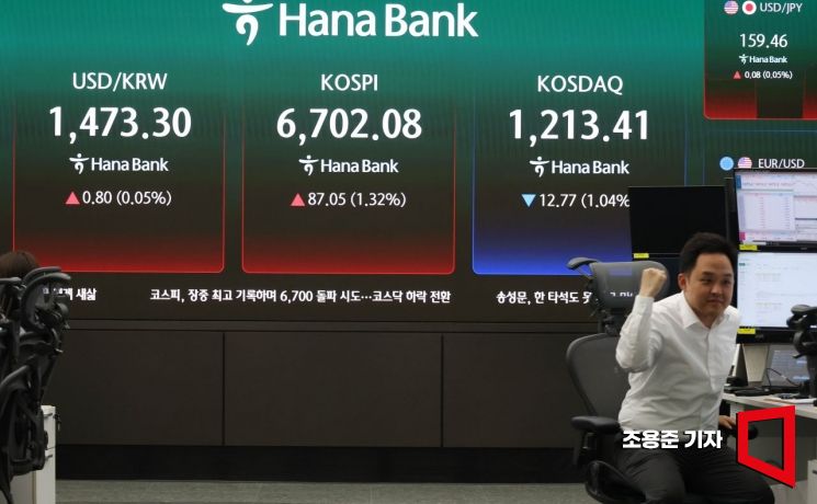 코스피가 전날 6600선을 넘어선 데 이어 장중 6700선까지 돌파한 28일 서울 중구 하나은행 본점 딜링룸에서 직원이 증시와 환율 등을 모니터하고 있다. 이날 코스피는 전 거래일 대배 0.48% 오른 6646.80으로 장을 시작했다.다.