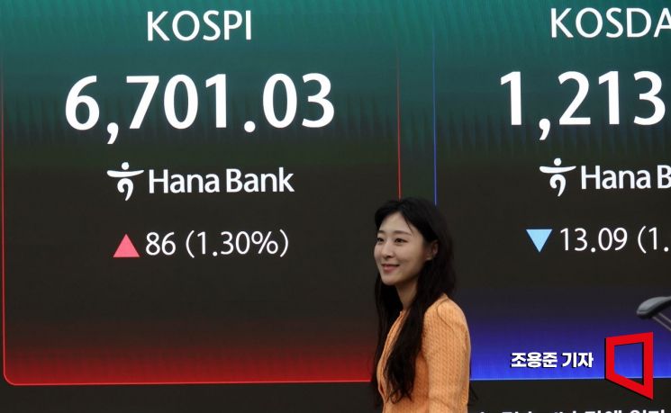 코스피가 전날 6600선을 넘어선 데 이어 장중 6700선까지 돌파한 28일 서울 중구 하나은행 본점 딜링룸에서 직원이 증시와 환율 등을 모니터하고 있다. 이날 코스피는 전 거래일 대배 0.48% 오른 6646.80으로 장을 시작했다.