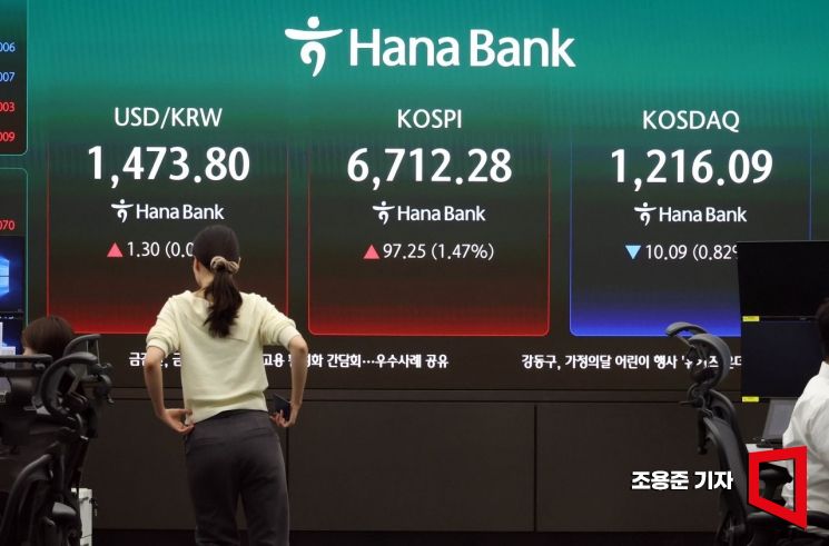 코스피가 전날 6600선을 넘어선 데 이어 6700선까지 돌파한 28일 서울 중구 하나은행 본점 딜링룸에서 직원이 증시와 환율 등을 모니터하고 있다. 이날 코스피는 전 거래일 대배 0.48% 오른 6646.80으로 장을 시작했다.