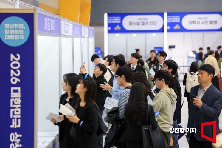 28일 서울 서초구 aT센터에서 열린 '2026 대한민국 상생 채용박람회'에 참가한 구직자들이 채용게시판을 보고 있다.