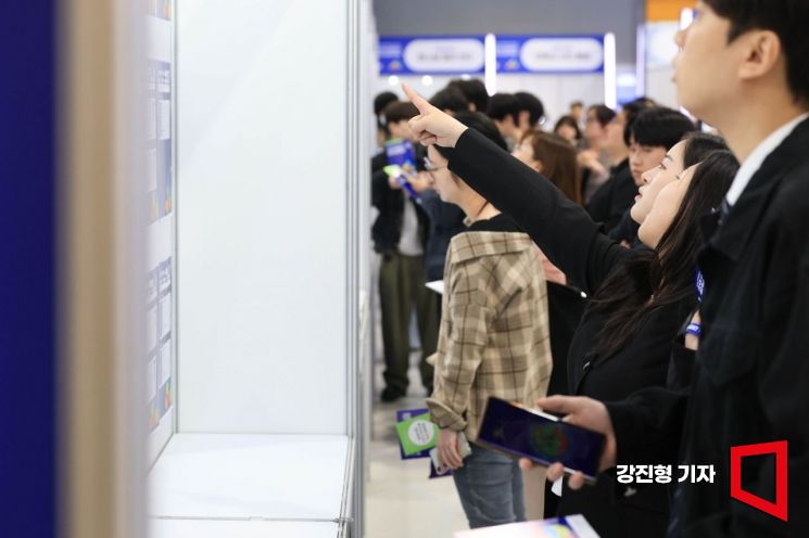 28일 서울 서초구 aT센터에서 열린 '2026 대한민국 상생 채용박람회'에 참가한 구직자들이 채용게시판을 보고 있다.