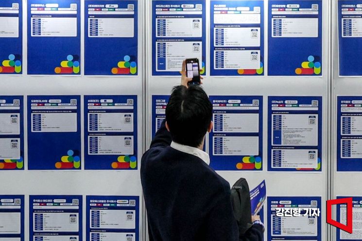 28일 서울 서초구 aT센터에서 열린 '2026 대한민국 상생 채용박람회'에 참가한 구직자들이 채용게시판을 보고 있다.