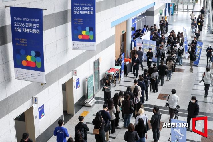 28일 서울 서초구 aT센터에서 열린 '2026 대한민국 상생 채용박람회'에 참가한 구직자들이 박람회장으로 입장하기 위해 줄을 서고 있다.