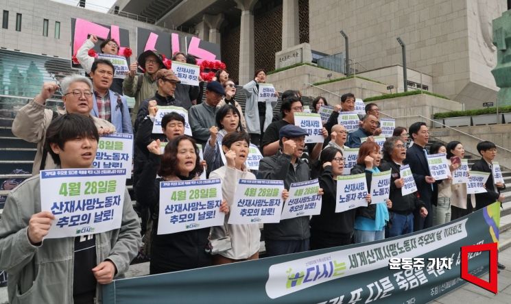 28일 산업재해노동자의 날을 맞아 산재피해가족네트워크 회원들이 서울 종로구 세종문화회관 계단에서 기자회견을 갖고 있다.