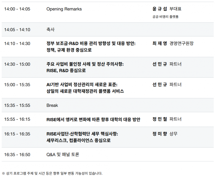다음 세션에서는 정민철 대학 컨설팅 리더(파트너)가 지역혁신중심 대학지원체계(RISE) 사업 운영 과정에서 제도 환경 변화가 대학에 미치는 영향을 짚고, 향후 대학이 고려해야 할 중장기적 대응 방향을 제시한다. 정미향 비영리전문 세무팀 리더가 대학 재정 실무자가 유의해야 할 세무 리스크와 컴플라이언스 관리에 대해 설명한다.
