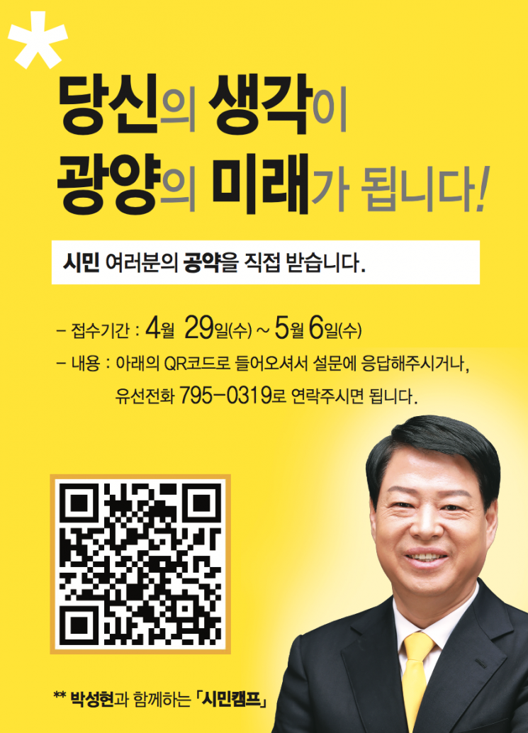 한편 박성현 예비후보는 현재 철강.항만 리뉴얼 24시 올 캐어 돌봄센터 구축,민생지원금 지급 등 5차에 걸친 릴레이 공약을 발표하며 정책 행보를 이어가고 있다. 이번 시민 공약 접수를 통해 수집된 의견들은 5월 중순께 '시민이 만든 광양 희망 공약"이라는 이름으로 최종 발표될 예정이다.