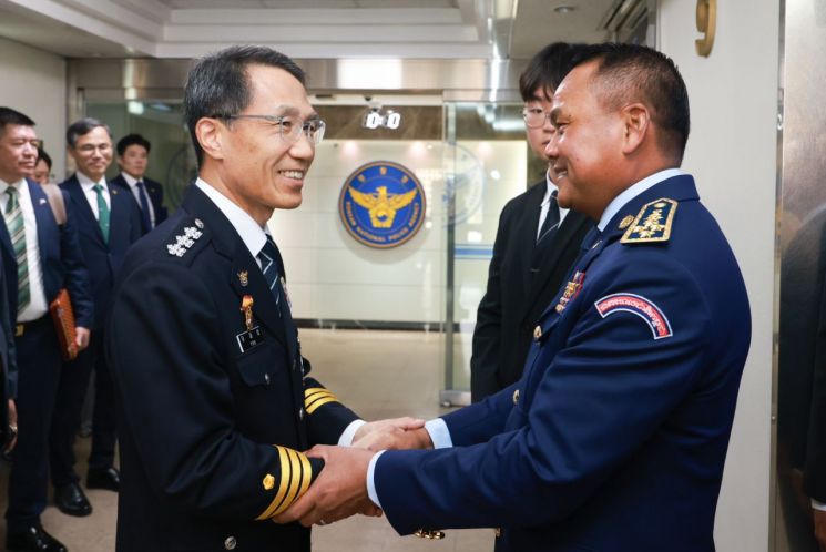 유재성 경찰청장 직무대행이 29일 '한-캄보디아 치안총수 회담'에 앞서 서울 서대문구 경찰청에서 써 탯(Sar Thet) 캄보디아 경찰청장과 만나 악수하고 있다. 경찰청