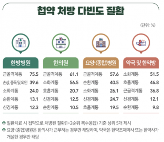 조사 결과, 한의원과 한방병원에서 처방한 첩약과 한약제제는 건강 증진이나 미용보다는 근골격계 질환 치료 목적이 가장 많았다. 처방 용도 중 '질환 치료'가 차지하는 비율은 한방병원이 84.7%, 한의원이 77.3%에 달했다. 특히 첩약 처방이 가장 빈번한 질환은 근골격계통으로, 한방병원(75.5%)과 한의원(61.1%) 모두에서 1위를 기록했다.