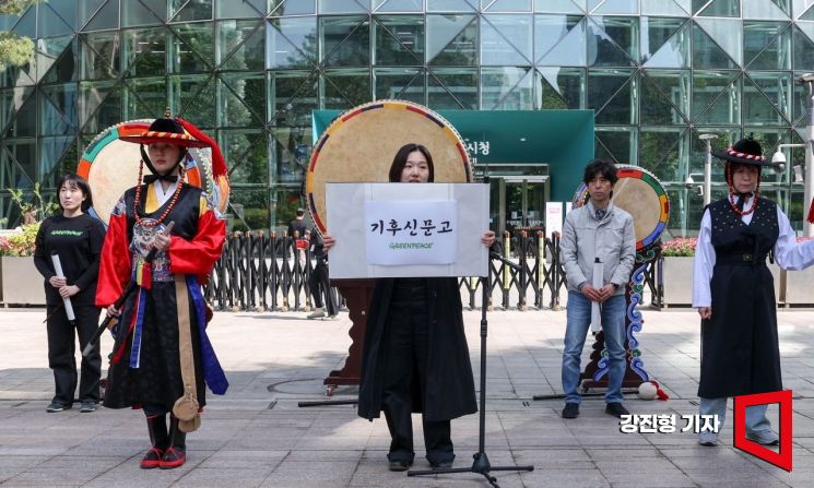29일 서울 중구 서울시청 앞에서 그린피스 소속 관계자가 서울시 기후예산제 여론조사 결과를 발표하고 있다.