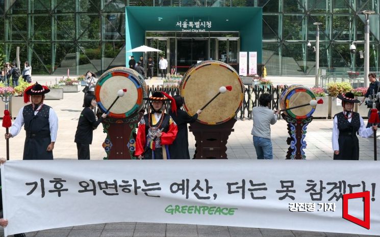 29일 서울 중구 서울시청 앞에서 그린피스 소속 관계자들이 서울시 기후예산제 여론조사 결과를 발표한 뒤 '기후 신문고' 퍼포먼스를 펼치고 있다.