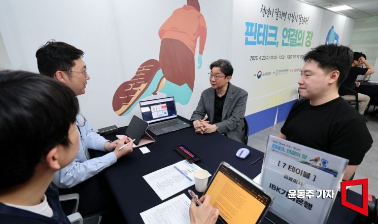 이억원 금융위원장이 29일 서울 마포구 프론트원에서 열린 '핀테크, 연결의 장' 행사장내 IBK기업은행 부스를 방문, 예비창업자와 의견을 듣고 있다.