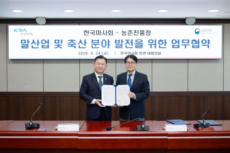 농진청과 마사회는 지난 24일 말산업과 축산 발전을 위한 업무협약을 체결했다. 두 기관은 이번 협약을 통해 맞춤형 치유 프로그램 개발과 현장 확산, 승용마 실증·조련 및 보급 확대, 국산 열풍건초 생산 및 유통 기반 구축 등 말산업 전반에 걸쳐 협력하기로 했다.