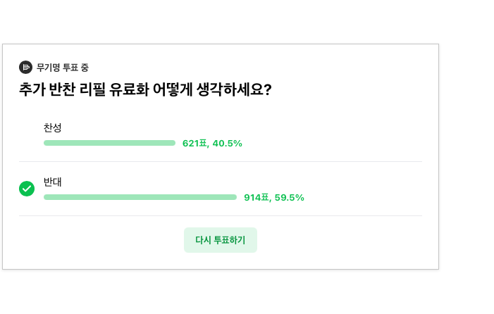 최근 자영업자 커뮤니티에서도 추가 반찬 유료화를 둘러싼 논쟁이 벌어졌다. '추가 반찬 리필 유료화 찬성 대 반대' 투표에서 총 1535명 중 621명, 40.5%가 찬성했고 914명, 59.5%는 반대했다. 찬성 측은 원재료 가격 상승과 음식물 쓰레기 증가를 주된 이유로 들었다. 반면 반대 측은 반찬 비용이 이미 주메뉴 가격에 포함된 서비스라는 소비자 인식이 강한 만큼, 유료화가 자칫 단골 이탈로 이어질 수 있다고 우려했다.