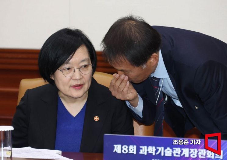 한성숙 중소벤처기업부 장관(왼쪽)과 김현종 국가안보실 1차장이 30일 서울 종로구 정부서울청사에서 열린 과학기술관계장관회의에 참석해 대화를 하고 있다.