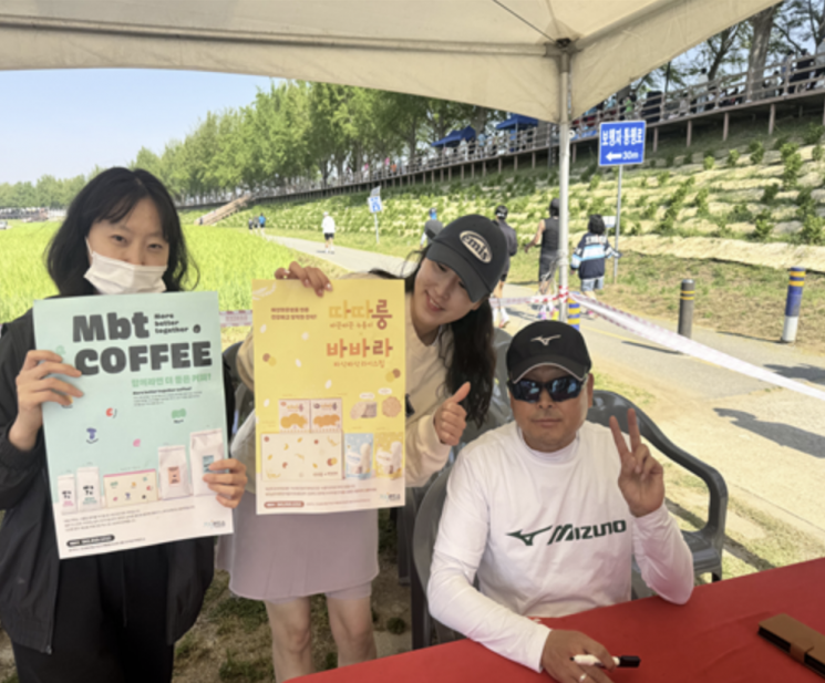 특히 직접 볶은 원두로 내린 대표 제품 엠비티커피(Mbt커피) 시음 행사에는 마라톤 참가자와 시민들의 발길이 이어지며 준비된 커피 1000잔이 조기 소진됐다. 이날 같은 행사장에서 사인회를 진행한 이봉주 선수도 커피를 맛보고 발달장애인 가족 대표들과 함께 인증사진을 찍으며 응원을 전했다.