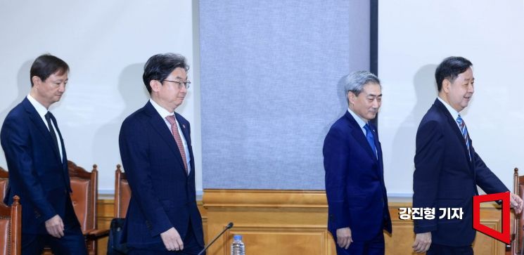 구윤철 경제부총리 겸 재정경제부 장관(오른쪽)을 비롯한 경제관계 기관장들이 30일 서울 중구 은행회관에서 열린 확대거시경제금융회의에 참석하고 있다. 왼쪽부터 이찬진 금융감독원장, 이억원 금융위원장, 신현송 한국은행 총재, 구윤철 경제부총리.