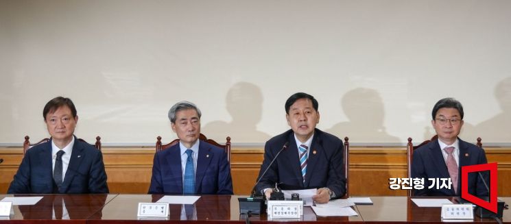 구윤철 경제부총리 겸 재정경제부 장관(오른쪽 두 번째)이 30일 서울 중구 은행회관에서 열린 확대거시경제금융회의에 참석해 모두발언 하고 있다. 왼쪽부터 이찬진 금융감독원장, 신현송 한국은행 총재, 구윤철 경제부총리, 이억원 금융위원장.