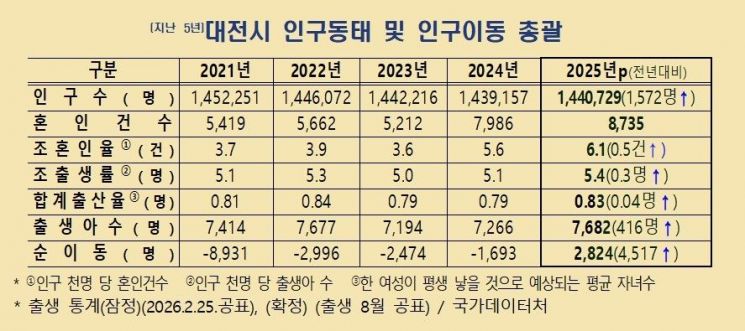 한편 대전의 2025년 조혼인율은 6.1로 전국 1위를 기록했으며, 혼인이 출생의 선행지표라는 점에서 향후 출생률에 대한 기대를 높이고 있다. 조출생률(5.4명)과 합계출산율(0.83명)도 특·광역시 중 3위권 수준을 유지하고 있다.